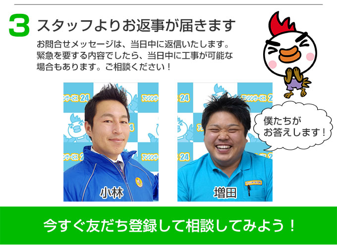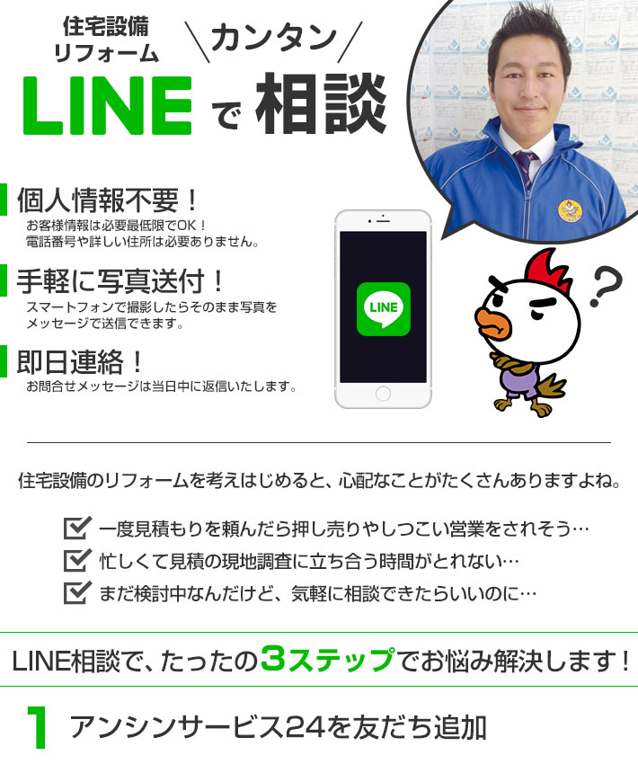 おかげさまで毎日元気に施工しています!プロが頑張っている後ろ姿をぜひ見て下さい!! LINE|浴室リフォーム.COM LINE公式アカウントで簡単お見積り メッセージにコピーペーストしてご利用ください ■お名前 ■〇〇県〇〇市 ■ご相談内容 〇〇に困っていて取替工事をしたらいくら位かかりますか? 最短で取替工事はいつになりますか? 2023年5月1日 1:40 PM カテゴリー : アンシンサービス24 | タグ : アンシンサービスの特徴 2023年2月12日 3:48 PM カテゴリー : アンシンサービス24 | タグ :